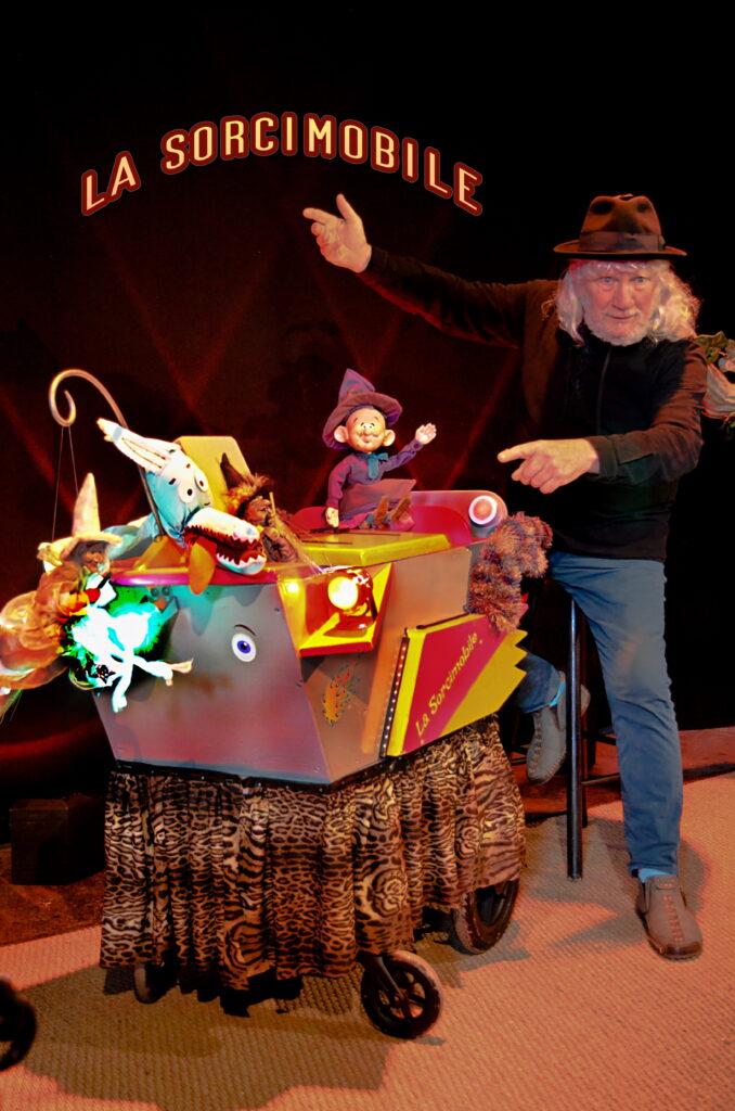 Un véhicule venu de nulle part qui ne ressemble à rien mais dans lequel on découvre, entre autres, une sorcière qui ne fait que des bêtises, un ou deux grands méchants loups, un vieux grimoire qui clignote, un oiseau des îles qui chante comme une casserole, un instrument de musique venu du Brésil, une méchante sorcière qui veut s’évader…